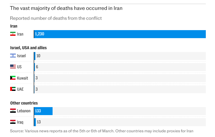 报告的冲突死亡人数数据显示,伊朗战争一周来,绝大多数死亡发生在伊朗。据伊朗官员称,伊朗人死亡约787人,受伤超过1500人。