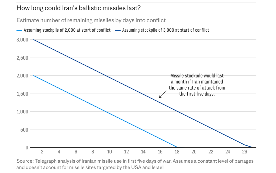 和美国一样,伊朗弹药耗尽的迹象更加明显,无法在反抗性报复攻击中尽情投入。所以数据显示,德黑兰攻击节奏显著减缓,这也可能是由于美国和以色列削弱敌方进攻能力的行动所致。