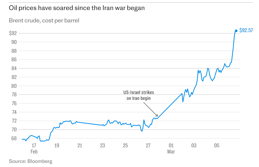 伊朗战争对国际油价的影响更为显著。伊朗革命卫队声称完全控制霍尔木兹海峡——这条最窄处仅21英里宽的海峡,全球五分之一的石油和天然气运输通过——这导致油轮运输量在几天内暴跌了90%,能源价格飙升至每桶90美元以上。