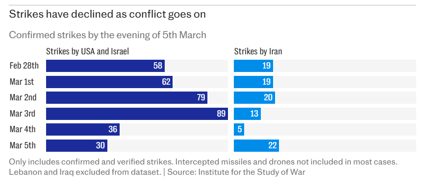 ISW已确认美以至少对伊朗实施了354次打击,而德黑兰对海湾国家和以色列发动的袭击则接近100次。随着冲突的继续,轰炸有所减少。上图是3 月 5 日晚间确认轰炸。