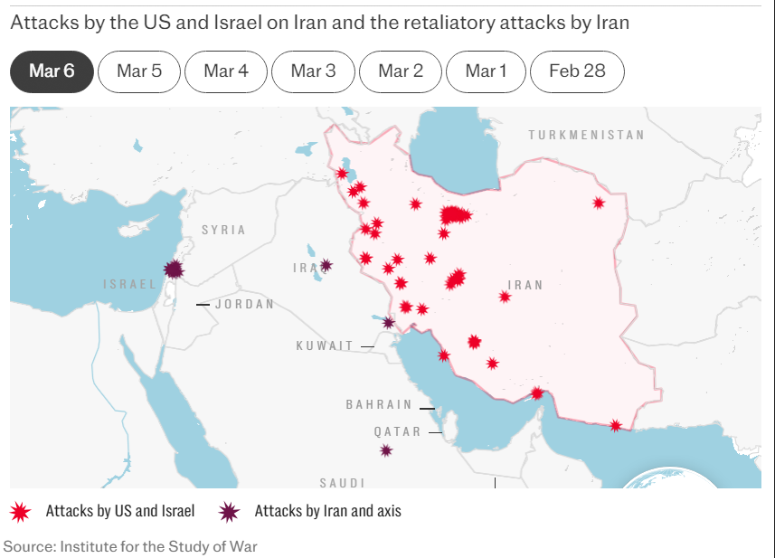 上图是3月6日美国和以色列对伊朗的袭击(红点)以及伊朗的报复性袭击地点(咖点)。可以明显看到空袭打击的不对等。