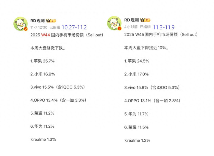 排名第五的是华为,它的市场份额为11.7%,和上周(11.2%)相比有一定的提升。在没有新机开售的情况下,华为不仅实现了份额提升,还重回国内榜单第五名,看来最近发布的新机对其影响比不太大。下周华为的看点是Mate70 Air开售,市场份额应该会有明显的提升,好奇的是能不能凭借该机进入国内前三。至于华为Mate80系列,目前发布会暂定11月底,同时发布的还有华为Mate X7。
