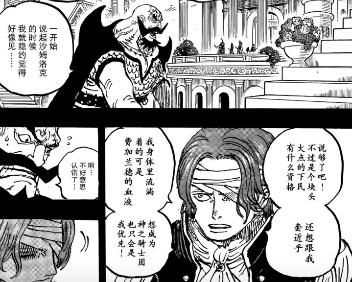 另外很有可能是黑胡子伤到香克斯后,说出了他的身世之谜。同时也透露出自己的身世是洛克斯之子,而你却是天龙人加林之子。这让香克斯很惊讶,结合之前罗杰船长的话,于是来到圣地玛丽乔亚,开始了卧底之旅。