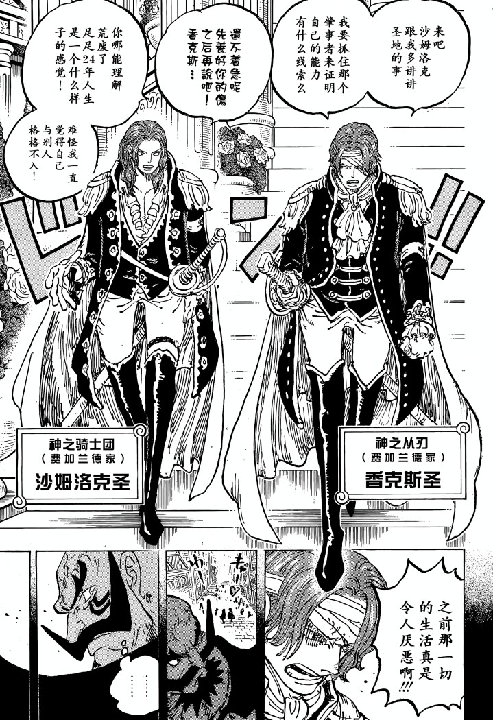 香克斯也不知道是因为什么而来到圣地玛丽乔亚,找到自己的亲生父亲加林和双胞胎哥哥夏姆洛克,因此他也成为了神之从刃的一员。不过此时的香克斯位于15年前,他的左眼缠绕绷带,显然是被敌人所伤,而这个人百分百就是黑胡子了。