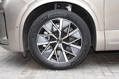 车身侧面通过隐藏式门把手、悬浮式车顶及255/50 R20英寸多辐式双色轮毂,既降低风阻系数,又强化了运动属性。分段式不可开启全景天窗采用高强度隔热玻璃,覆盖面积1.2㎡,兼顾观星体验与车内降温需求。车尾设计突破传统,2607mm超长门型尾灯内置8种智慧交互灯语模式,支持充电时呼吸效果,兼具功能性与仪式感。