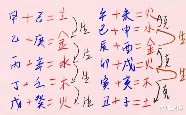将十个天干排成两行,按照阴阳配对即可得出:甲己合化土,乙庚合化金,丙辛合化水,丁壬合化木,戊癸合化火。